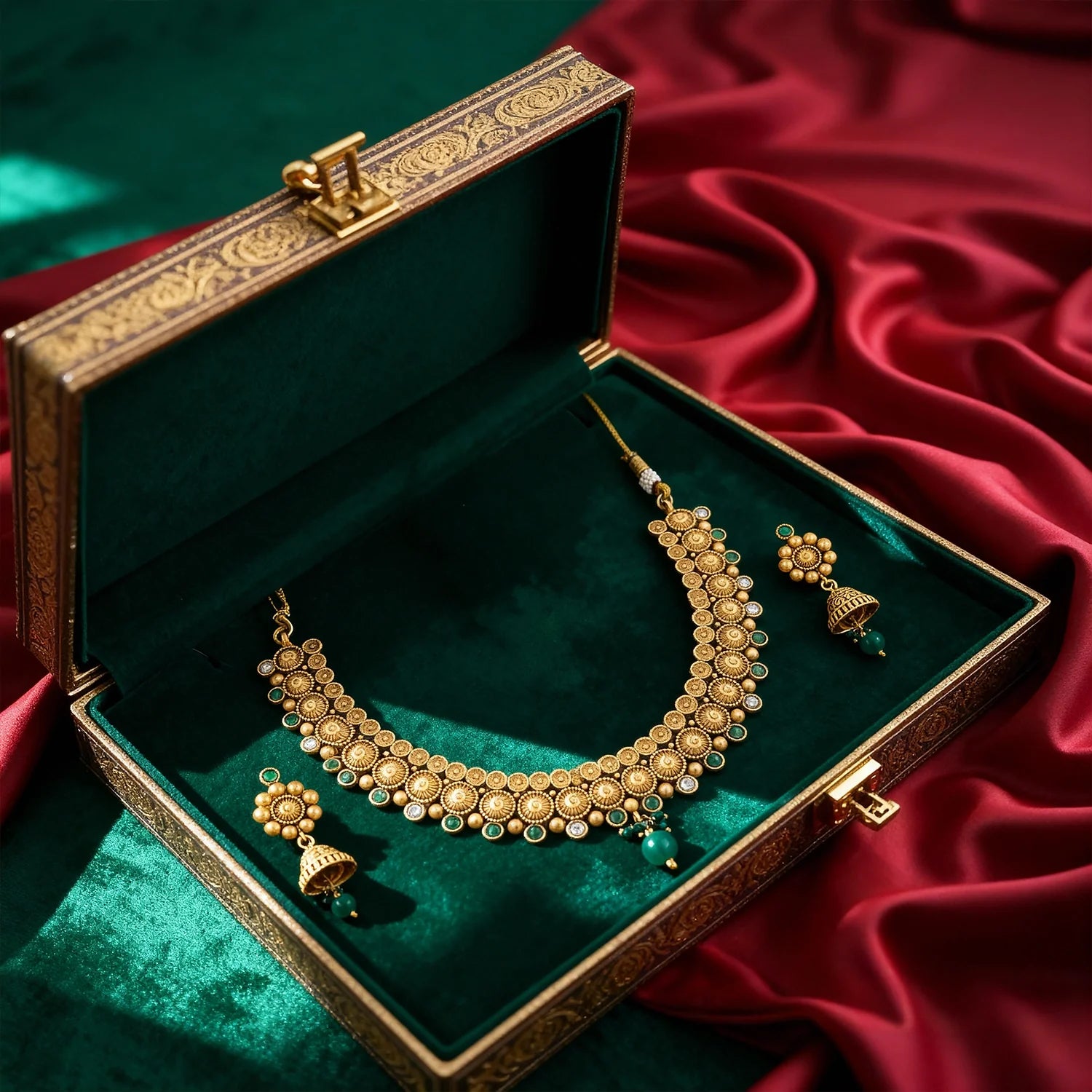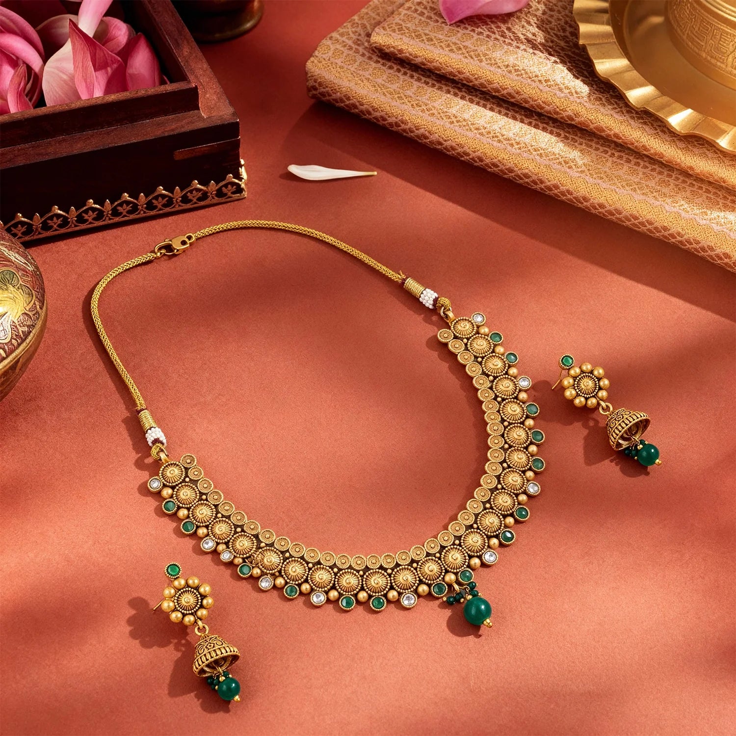 This 22K gold-plated brass material necklace set features a teardrop emerald-green pendant framed with Cubic Zirconia stones in a leafy design. Perfect for weddings, festive occasions, and elegant soirées.