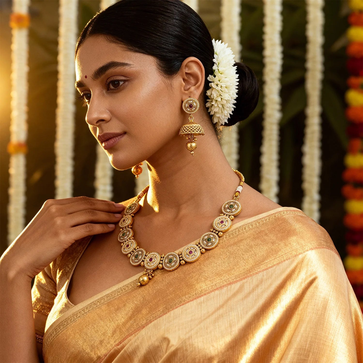 Embark on a journey of timeless beauty with our captivating antique necklace. Crafted with love and care, this exceptional piece features a copper alloy base metal artfully coated in a brilliant gold polish. The combination of a light chain and a strikingly heavy pendant creates a stunning contrast, making it a remarkable choice for any traditional dress.