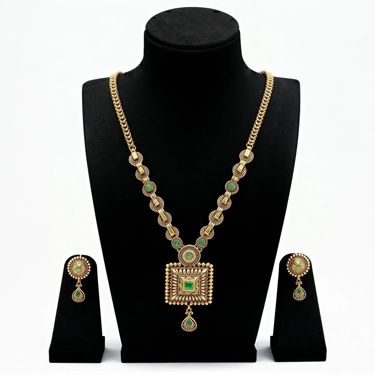 This beautifully crafted long necklace set features intricate traditional detailing with premium copper base and high-quality gold plating. Designed for festive and bridal wear, it includes matching earrings for a complete ethnic look. Perfect for weddings, celebrations, and cultural events. Lightweight, durable, and finely polished for a luxurious appearance.