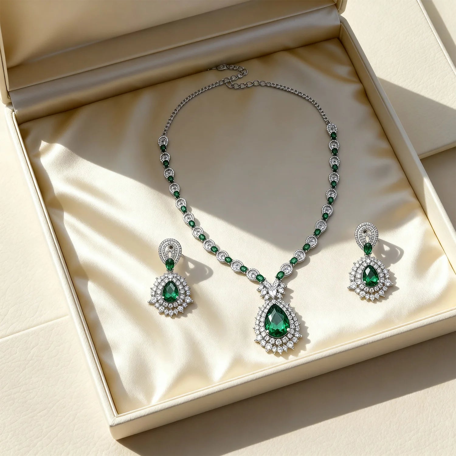 This 22K gold-plated brass material necklace set features a teardrop emerald-green pendant framed with Cubic Zirconia stones in a leafy design. Perfect for weddings, festive occasions, and elegant soirées.
